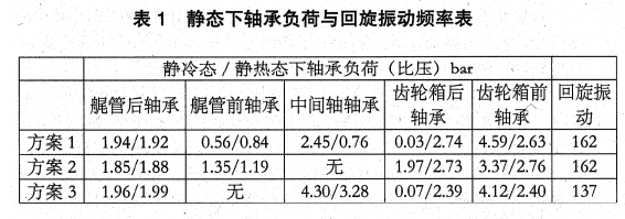 方案一是設(shè)計(jì)院提供的方案,也是比較普通設(shè)計(jì)的方案,在靜熱態(tài)時(shí)軸系強(qiáng)度滿足要求,軸承之間的跨距滿足要求,軸承負(fù)荷均滿足要求,但是在靜冷態(tài)時(shí)候,齒輪箱后軸承負(fù)荷非常小,存在可能脫空的風(fēng)險(xiǎn)。
