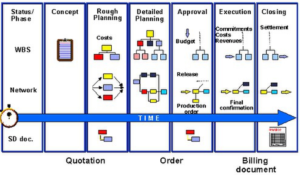 電力行業(yè)的項(xiàng)目管理雖然有其行業(yè)的特殊性,有其特殊的項(xiàng)目范圍、項(xiàng)目質(zhì)量、項(xiàng)目目標(biāo)的要求,但整體的項(xiàng)目控制方法,都是遵循著標(biāo)準(zhǔn)的項(xiàng)目管理流程而進(jìn)行的。SAP/PS模塊的設(shè)計(jì)原理就是嚴(yán)格遵循標(biāo)準(zhǔn)的項(xiàng)目管理理念。SAP/PS模塊以財(cái)務(wù)資金流為主線,重點(diǎn)針對項(xiàng)目時(shí)間,成本(投資控制),采購等業(yè)務(wù)進(jìn)行控制,通過與其他模塊的集成,實(shí)現(xiàn)資金流、物流和人力的統(tǒng)一,同時(shí)進(jìn)行有效的文檔管理。下圖列示了SAP/PS模塊中項(xiàng)目管理的內(nèi)容及周期。