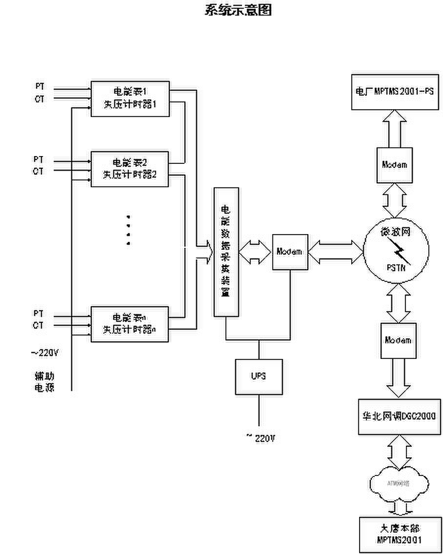 系統(tǒng)通訊有以下三部分,一部分為采集裝置與電能表的通訊,一部分為華北網(wǎng)調(diào)DG C2000主站、電廠MPTMS2001-PS子站與采集裝置之間的通訊,一部分為大唐國(guó)際本部新建MPTMS2001子站與網(wǎng)調(diào)DG C2000主站之間的通訊。