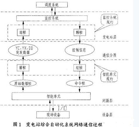 變電站綜合自動(dòng)化系統(tǒng)的通信功能,由系統(tǒng)與調(diào)度中心的通信及系統(tǒng)內(nèi)部設(shè)備間的通信兩部分組成。變電站綜合自動(dòng)化系統(tǒng)網(wǎng)絡(luò)通信過程原理見圖1。
