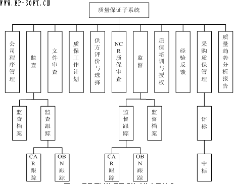 質(zhì)保管理子系統(tǒng)主要功能有公司程序管理、監(jiān)查監(jiān)督、糾正措施要求(CAR)、觀察意見(OBN)、質(zhì)量趨勢分析報告、質(zhì)保培訓與授權(quán)、供方評價與選擇、質(zhì)保工作計劃、質(zhì)保文件審查等。功能點之間的邏輯關(guān)系如圖3所示。
