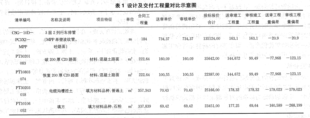 第一,現(xiàn)場施工工程量與結(jié)算施工工程量不相符。由于在設(shè)計階段沒有充分考量施工的實際情況,或者在施工現(xiàn)場管理以及物料管理過程中沒有做到精細(xì)化管理體系的構(gòu)建,進(jìn)而使得結(jié)算施工量與設(shè)計施工量存在一定的差距(見表1)。此種現(xiàn)象的存在,往往會導(dǎo)致審計審查時的退款金額較多,進(jìn)而客觀上增加了審計的工作量,也拖延了回款速率。