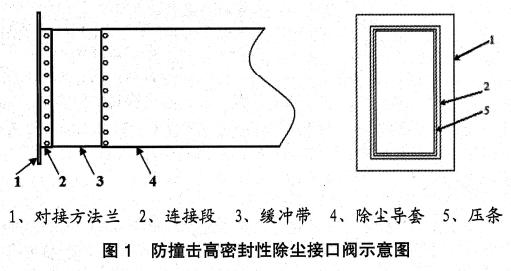 對接方法蘭1用鋼板制成,一端為對接平面,另一端通過連接段2與緩沖帶3連接,用壓條5固定連接;所述緩沖帶3由帶線層的皮帶制成,一端與方法蘭1連接,另一端與活動導(dǎo)套4連接,連接方式為螺栓連接,便于更換;所述除塵導(dǎo)套4用鋼板制成,由液壓頂桿驅(qū)動頂出,完成接口閥與除塵管道的對接。改造后結(jié)構(gòu)簡單、工作可靠、制造成本低、維修方便、避免了因撞擊對除塵裝囂造成損壞,起到保護(hù)除塵裝置和提高接口窯封性的作用。