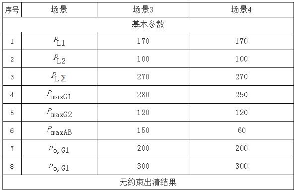 表2給出兩個無約束場景1、場景2的出清結(jié)果,也分別對應場景3、場景4下的無約束出清結(jié)果。