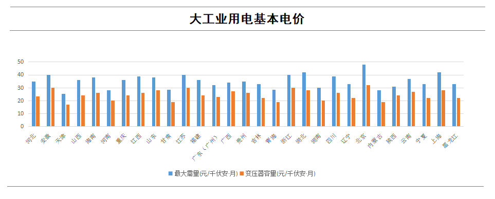 基本電價(jià)只有大工業(yè)用戶收取,分按最大需量和按變壓器容量收取。從基本電價(jià)的情況來看,按最大需量平均為35.1元/千瓦˙月,按變壓器容量平均約為24.4元/千瓦˙月,北京最高,天津最低。