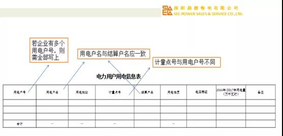 8. 電力用戶用電信息表,由企業(yè)填寫,并由深圳供電局審核(加蓋公章和相關負責人簽字)。由于每月3日為集中提交材料截止日期,相關申報材料請盡量在每月3日前提交;可能有問題需修改的材料,請企業(yè)自行預留足夠的修改時間。在截止日期后提交材料而企業(yè)又不愿意安排至下一個月的,由企業(yè)自行去各區(qū)供電局出具蓋各區(qū)供電局公章并由相關負責人簽字的用電信息附表,各區(qū)經(jīng)促局(新區(qū)經(jīng)服局)負責跟各區(qū)供電局核實相關數(shù)據(jù)之后,對材料進行初審后直接交付深圳市經(jīng)貿(mào)信息委(留給企業(yè)用戶準備資料的時間已經(jīng)不足半個月,希望用戶伙伴們抓緊時間收集材料,以便及早享受優(yōu)惠電價)。