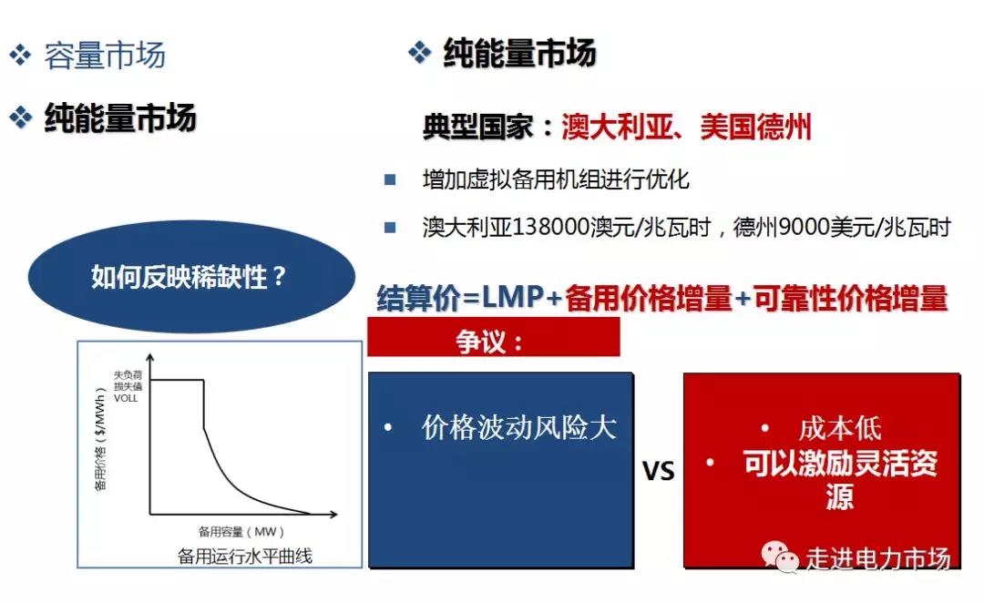 還有一種方式就是澳洲和美國德州,稀缺定價(jià)的方式,其實(shí)美國其他地方也有,只不過他們的價(jià)格帽沒有那么高。美國大部分能量市場會(huì)聯(lián)合備用優(yōu)化,這個(gè)時(shí)候如果備用稀缺,會(huì)引入一個(gè)虛擬的備用機(jī)組,調(diào)高價(jià)格。美國德州沒有容量市場,它的報(bào)價(jià)價(jià)格帽比較高,也就是和澳洲差不多,大概換算過來是六七十元/千瓦時(shí)。然后在結(jié)算的時(shí)候,會(huì)在實(shí)時(shí)能量價(jià)格里面加上備用價(jià)格增量和可靠性價(jià)格增量。這個(gè)備用價(jià)格增量如果是緊缺的時(shí)候會(huì)變得非常高。也就是說,讓這個(gè)價(jià)格反映稀缺的情況。
