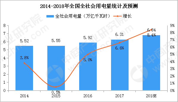 據(jù)初步統(tǒng)計數(shù)據(jù)顯示,2018年全國日均發(fā)電量為184.68億千瓦時,同比增長8.52%。其中,全社會用電量同比增速預(yù)計也將在8%以上,兩者均有望創(chuàng)七年以來新高。