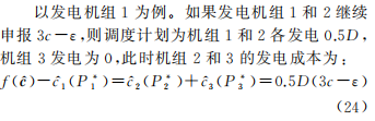根據(jù)價(jià)值公平分配機(jī)制,一臺發(fā)電機(jī)組獲得收益為該發(fā)電機(jī)組參與日前市場前后,其他機(jī)組總發(fā)電成本的變化。下面重點(diǎn)分析在價(jià)值公平分配機(jī)制下,發(fā)電機(jī)組申報(bào)真實(shí)成本為其占優(yōu)策略。