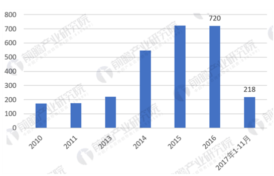 圖表5:2010-2017年新增核電裝機容量變化(單位:萬千瓦)