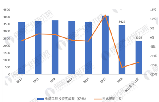 圖表3:2010-2017年全國電源工程完成投資額情況(單位:億元,%)