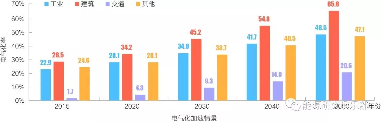 七是電氣化水平持續(xù)提升,電能成為能源供應(yīng)和消費(fèi)主體。電能在終端能源消費(fèi)結(jié)構(gòu)中占比持續(xù)提升,2030年提高至30%左右,2050年增至35%~46%。建筑部門是電氣化水平和提升潛力最高的部門,電氣化水平從2015年的29%提高到2015年的46%~66%。工業(yè)部門電氣化水平從2015年的23%提高到2050年的42%~49%。隨著終端電氣化水平的提高,發(fā)電能源占一次能源的比重也持續(xù)上升,常規(guī)轉(zhuǎn)型情景下在2035年超過50%,電氣化加速情景下在2025年即超過50%,并在2050年達(dá)到69%左右,如圖6。