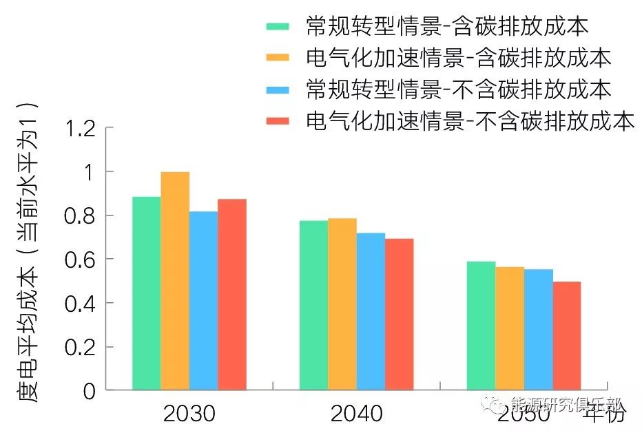 八是電力系統(tǒng)成本將呈現(xiàn)先升后降趨勢(shì)。當(dāng)前至2030年,電力需求保持較快增長,且新能源發(fā)電等新技術(shù)仍處于發(fā)展期,電力系統(tǒng)總成本持續(xù)上升。2030-2050年,電力需求增長逐漸趨于飽和,新能源發(fā)電等技術(shù)日益成熟,系統(tǒng)成本進(jìn)入下降期,此階段能源發(fā)展的低碳性目標(biāo)與經(jīng)濟(jì)性目標(biāo)逐漸重合。相比于電力系統(tǒng)總成本,度電平均成本的達(dá)峰時(shí)間更早,預(yù)計(jì)2050年度電成本約為當(dāng)前水平的一半左右,如圖13。