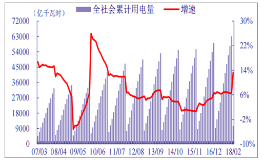 由于2018年春節(jié)假期位于2月中下旬,而2017年在1月份,疊加極寒天氣因素,1-2月份,全社會用電量10552億千瓦時,同比增長13.3%,增速同比提高6.9個百分點。