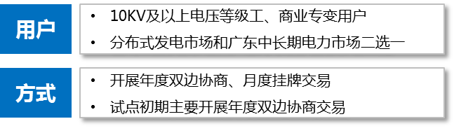 通過(guò)分析2018年3月廣東省發(fā)布《分布式發(fā)電市場(chǎng)化交易試點(diǎn)規(guī)則大綱(征求意見稿)》,我們可以看出:分布式發(fā)電交易從形式上更類似于之前的大用戶直供電模式。