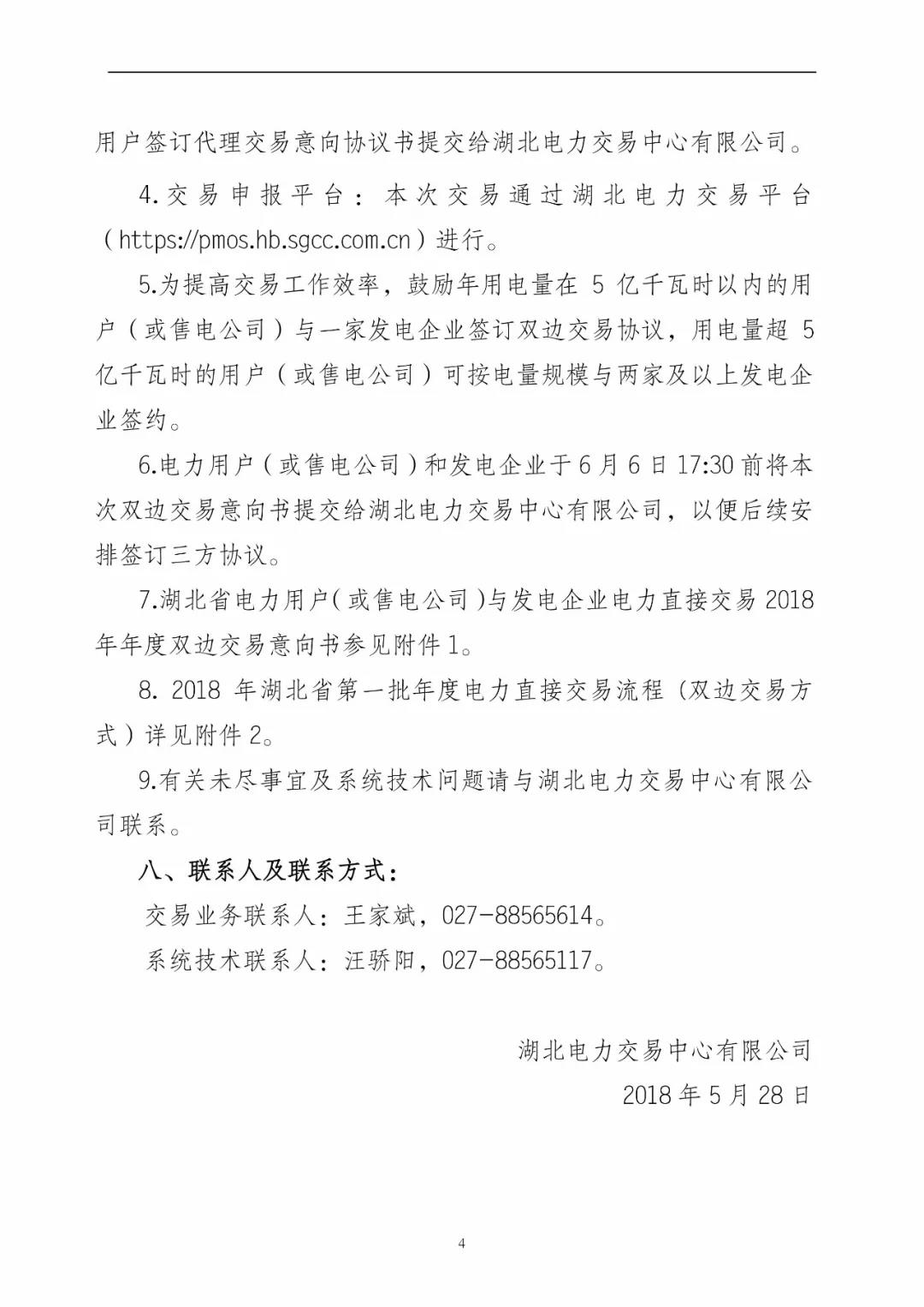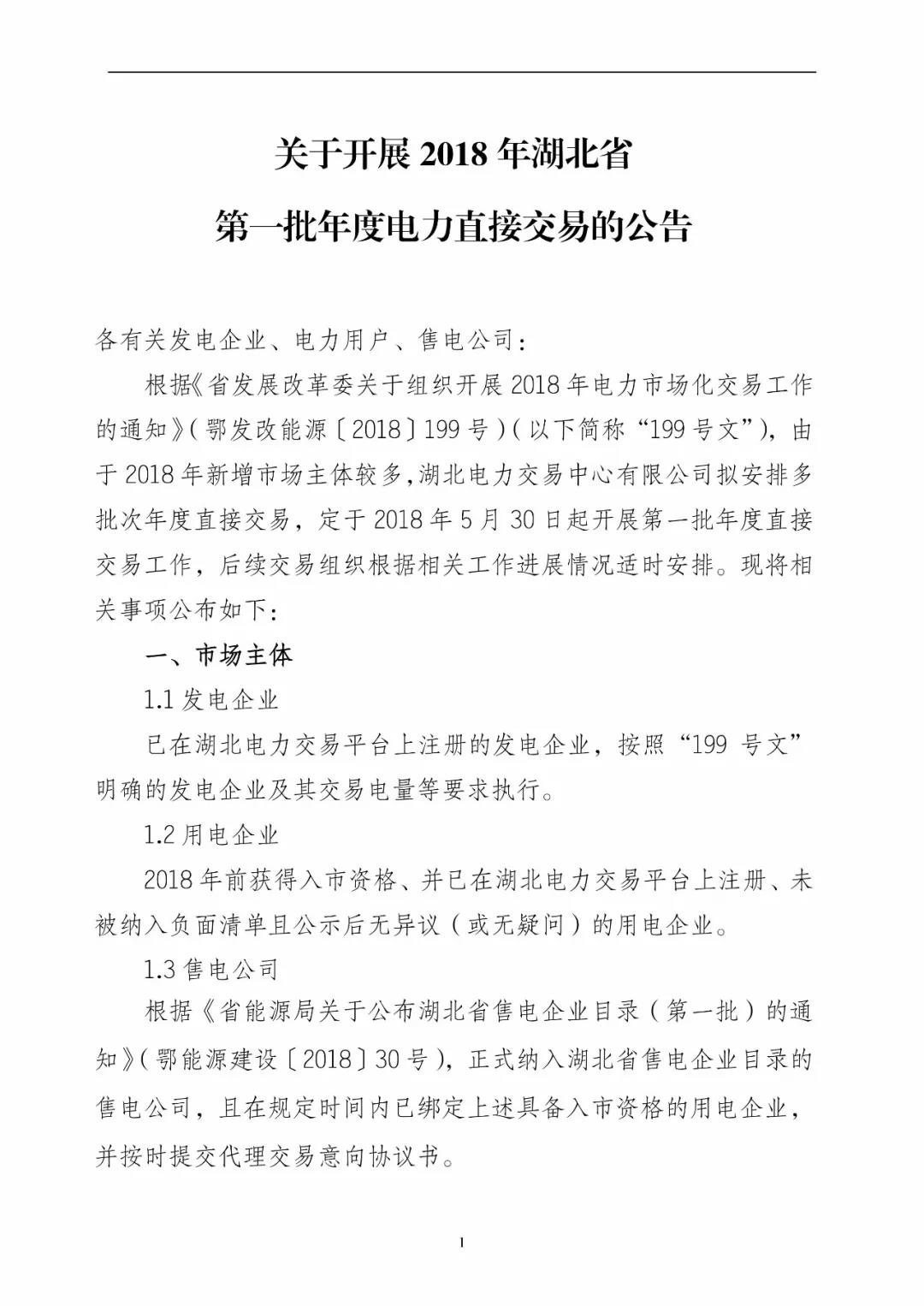 根據(jù)《關(guān)于開展 2018 年湖北省第一批年度電力直接交易的公告》湖北電力交易中心有限公司擬安排多批次年度直接交易,定于2018 年 5 月