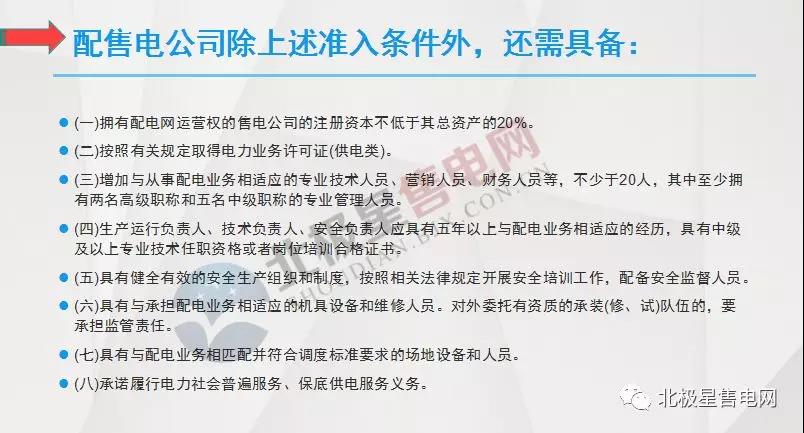 另外,擁有配電網(wǎng)經(jīng)營權(quán)的售電公司,準入條件也是有著特別的規(guī)定,除滿足上述條件外,其注冊資本不低于其總資產(chǎn)的20%,并且要取得供電類電力業(yè)務(wù)許可證。不少于20名從事配電業(yè)務(wù)相適應(yīng)的專業(yè)技術(shù)人員、營銷人員、財務(wù)人員,其中至少擁有兩名高級職稱和五名中級職稱的專業(yè)管理人員。生產(chǎn)運行負責(zé)人、技術(shù)負責(zé)人、安全負責(zé)人應(yīng)具有五年以上與配電業(yè)務(wù)相適應(yīng)的經(jīng)歷,具有中級及以上專業(yè)技術(shù)任職資格或者崗位培訓(xùn)合格證書。
