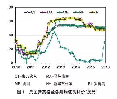 各國綠證交易價格主要受證書供需形勢影響,同時也與可再生能源發(fā)電技術(shù)類型、季節(jié)波動、監(jiān)管懲罰強度等多種因素相關(guān),具有較大的差異性和波動性。從美國新英格蘭地區(qū)各州的綠證現(xiàn)貨價格來看,馬薩諸塞、羅得島、康乃狄克和新罕布什爾州的綠證供應(yīng)在2013~2015年期間供應(yīng)偏緊,單位綠證的交易價格達50~60美元,而同期的緬因州由于生物質(zhì)發(fā)電計入綠證核發(fā)范圍、綠證供應(yīng)顯著高于需求,價格降至10美元以下。澳大利亞大型發(fā)電技術(shù)證書價格因供應(yīng)增加,自2016年下半年以來震蕩下行,但截至2017年6月仍高于75澳元;小型技術(shù)證書則主要受限價、罰款等因素影響,一直保持在最高限定價格40澳元附近。此外,從部分國家和地區(qū)的交易市場來看,風電由于成本和價格較低在早期時是綠證交易主體,太陽能發(fā)電由于價格快速下降、有取代風電成為交易主體的趨勢(見圖1、圖2)。