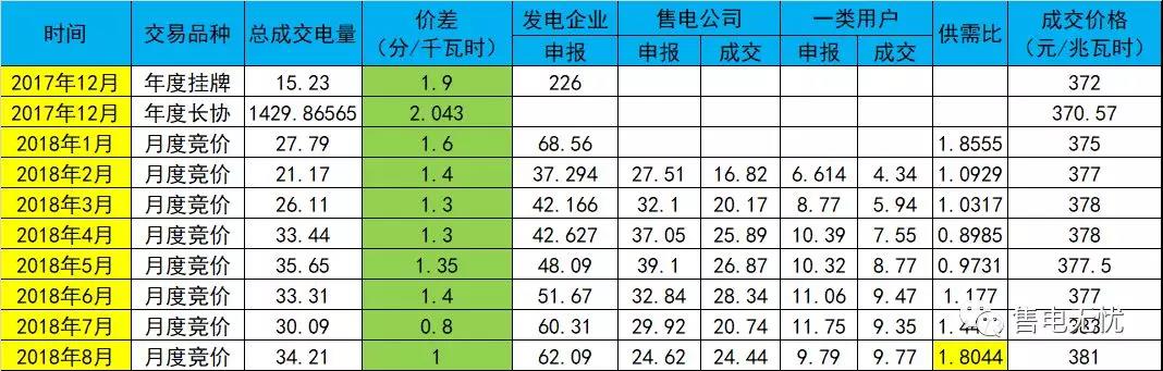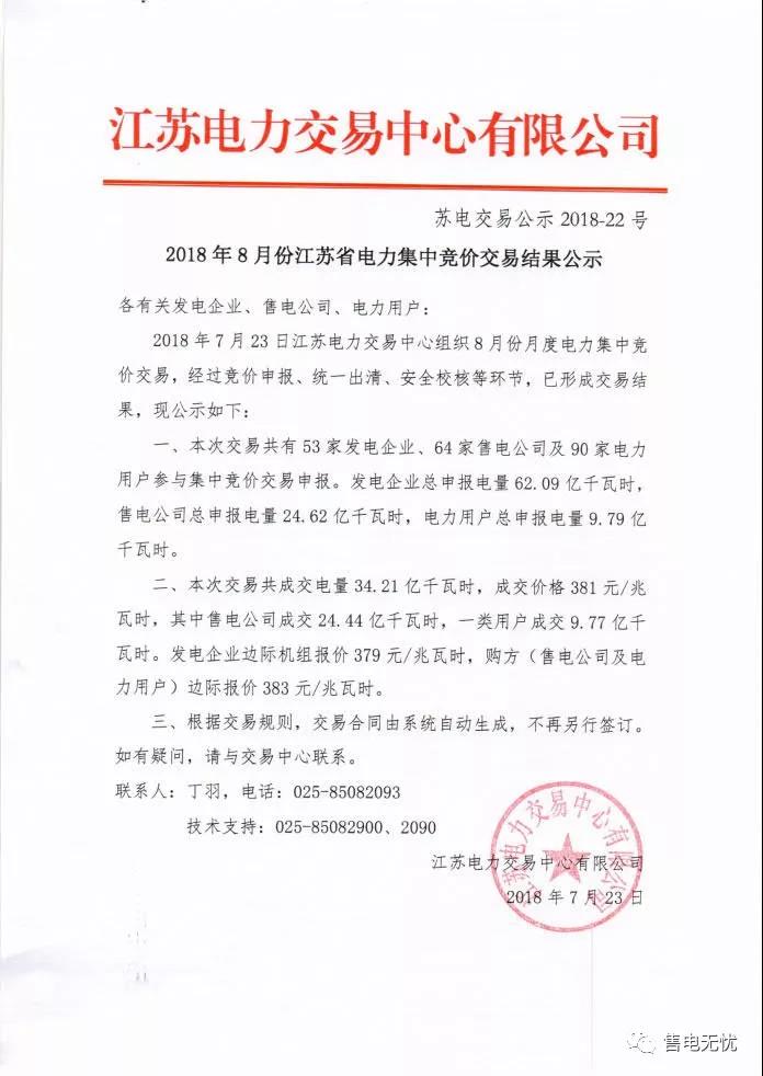 2018年7月23日,江蘇電力交易中心公布了8月份月度集中競價(jià)結(jié)果,成交電量規(guī)模34.21億千瓦時(shí),成交價(jià)格381元/兆瓦時(shí),價(jià)差較上個月8厘上升2厘,回到1分錢/千瓦時(shí)。