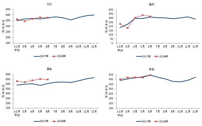 6月份,四大高載能行業(yè)用電量合計1636億千瓦時,同比增長4.0%,占全社會用電量的比重為28.9%。其中,化工行業(yè)用電量376億千瓦時,同比增長2.5%;建材行業(yè)用電量319億千瓦時,同比增長3.6%;黑色金屬行業(yè)用電量447億千瓦時,同比增長10.4%;有色金屬冶煉行業(yè)494億千瓦時,同比增長0.2%。