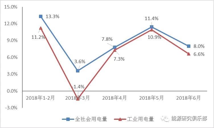 1~2月和5月用電量同比增速創(chuàng)下8年新高。分月看,1~2月用電量增速最快,主要是由于年初“冷冬”導致取暖負荷增加較大,且電能替代效果顯著、各地“煤改電”工程進展速度較快增加了冬季的電力消費;3月用電量增速大幅下降,主要是由于今年春節(jié)較晚、企業(yè)庫存偏高,且受到環(huán)保督查的影響不少企業(yè)處于停工狀態(tài),工業(yè)生產較慢,3月規(guī)模以上工業(yè)增加值同比增長6.0%,為去年9月以來最低,導致工業(yè)用電量同比下降;4月和5月,經過環(huán)保督查和冬季停工,工業(yè)生產普遍恢復,加上持續(xù)高溫天氣的影響,5月全社會用電量同比增長11.4%,創(chuàng)下近8年來同期新高;進入6月后南方區(qū)域降雨增多,用電量增速環(huán)比小幅回落3.4個百分點。