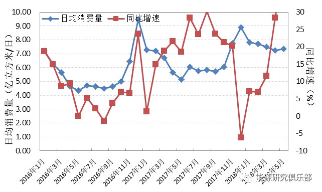 之間,天然氣化工同比略有下降。逐月來看,供暖季結束后用氣需求開始逐月下降。日均表觀消費量由去年12月的8.9億立方米/日,逐步回落至4月的7.2億立方米/日,5月需求略有增長至7.4億立方米/日。盡管相比一季度,二季度日均消費量有所下降,但消費量同比增速超過20%,遠高于一季度增速,天然氣消費“淡季不淡”特征明顯。