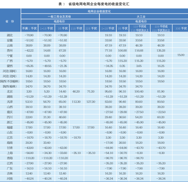 為了方便比較標(biāo)桿電價統(tǒng)一采用火電的標(biāo)桿電價,現(xiàn)將已公布輸配電價省份的電網(wǎng)企業(yè)每度電的收益變化匯總?cè)绫?3。