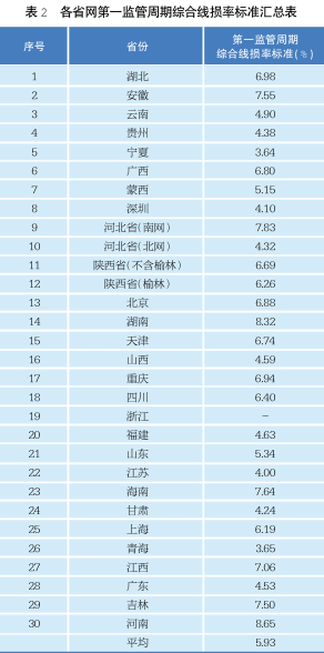 省網(wǎng)公布的第一監(jiān)管周期綜合線損率標(biāo)準(zhǔn)相差大,相互之間無可比性。在表 2 各省網(wǎng)第一監(jiān)管周期綜合線損率標(biāo)準(zhǔn)匯總表中: 綜合線損標(biāo)準(zhǔn)達(dá)到 8%以上的 2 個,7%~8%之間 5 個、6%~7%之間 9 個、5%~6%之間 2 個、4%~5%之間 9 個、4%以下 2 個。綜合線損標(biāo)準(zhǔn)最高的河南省網(wǎng)是最低的寧夏省網(wǎng)的 2.37 倍。省網(wǎng)的綜合線損率與統(tǒng)計口徑、當(dāng)?shù)仉娫刺攸c(diǎn)、是否包含抽蓄電站等諸多因素相關(guān)。各省網(wǎng)的省情不同,綜合線損也高低不同,因此各省網(wǎng)綜合線損標(biāo)準(zhǔn)之間也就沒有可比性。
