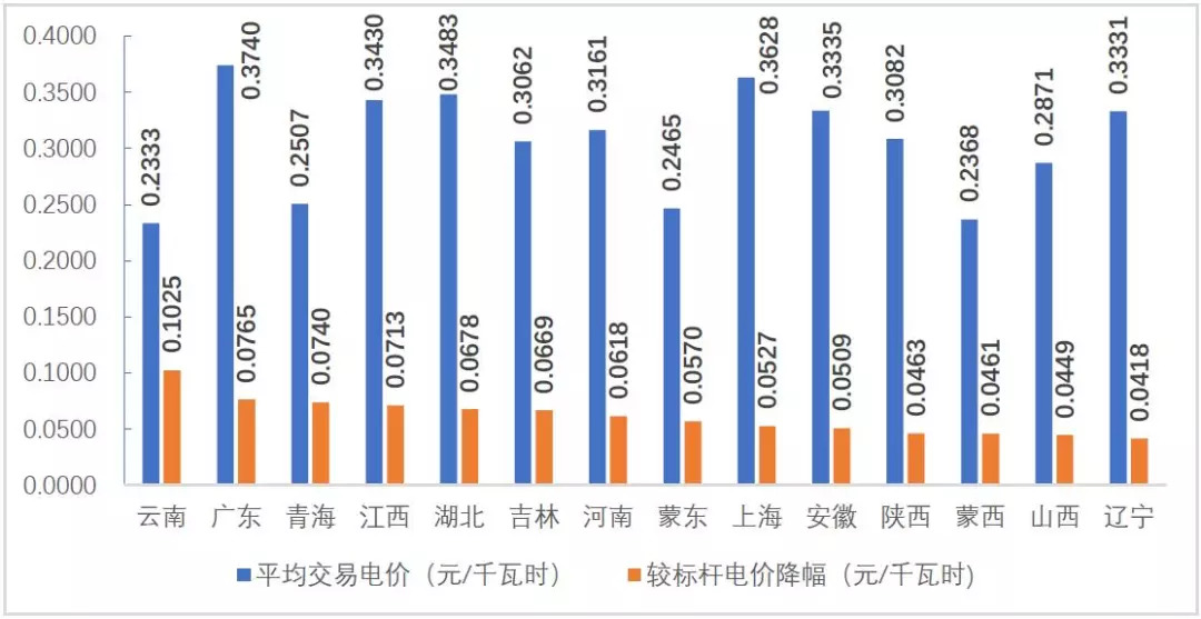 從分省煤電交易價格來看,與標(biāo)桿電價比較降幅最大的是云南,其市場交易平均電價為0.2333元/千瓦時,與標(biāo)桿電價相比降幅0.1025元/千瓦時,其次為廣東、青海、江西,其交易平均電價分別為0.3740元/千瓦時、0.2507元/千瓦時、0.3430元/千瓦時,降幅均超過0.07元/千瓦時。