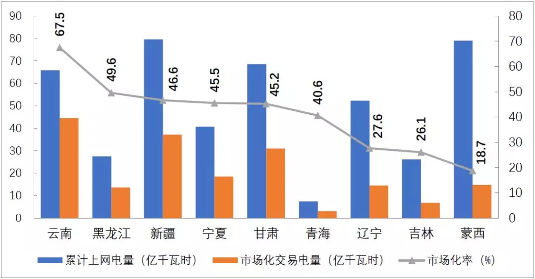 分省來看,市場交易電量占全社會用電量比重排序前三名的省份是云南、蒙西和江蘇,分別為49.4%、46.1%、44.5%;電力市場交易電量規(guī)模排序前三名的省份分別為江蘇1286億千瓦時、山東768億千瓦時、廣東599億千瓦時;外受電市場交易電量排序前三名的省份分別是江蘇286億千瓦時、山東242億千瓦時和浙江160億千瓦時。