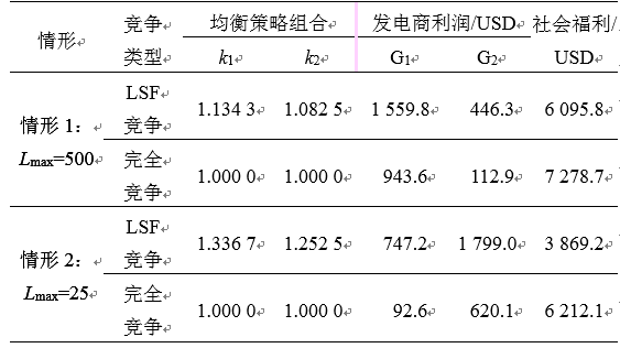 2)發(fā)電商在寡頭競(jìng)爭(zhēng)下的利潤(rùn)不一定都比完全競(jìng)爭(zhēng)下的高,發(fā)電商所處地理位置和自身機(jī)組的容量限制,可能導(dǎo)致發(fā)電商在寡頭競(jìng)爭(zhēng)下的收益低于完全競(jìng)爭(zhēng)下的。
