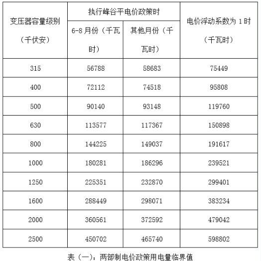 當然,對于不同的變壓器容量,選擇兩部制電價政策的用電量臨界點也是不同的。我們按照營業(yè)時間為8:30-22:30,分別測算了不同變壓器容量對應的兩部制電價用電量臨界點,如表(一)。我們看到,隨著變壓器容量的增加,對應的用電量臨界值也在增加。