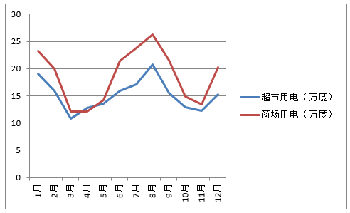 我們調(diào)查了解了部分商場和超市2017年度用電量等相關情況,圖(一)為某中等規(guī)模的超市及中型商場的用電量走勢,可以看出,商場與超市用電量走勢大致相同,冬季(12月-次年2月)和夏季(6-8月)用電量較多。這主要與夏季空調(diào)、冬季取暖有關。