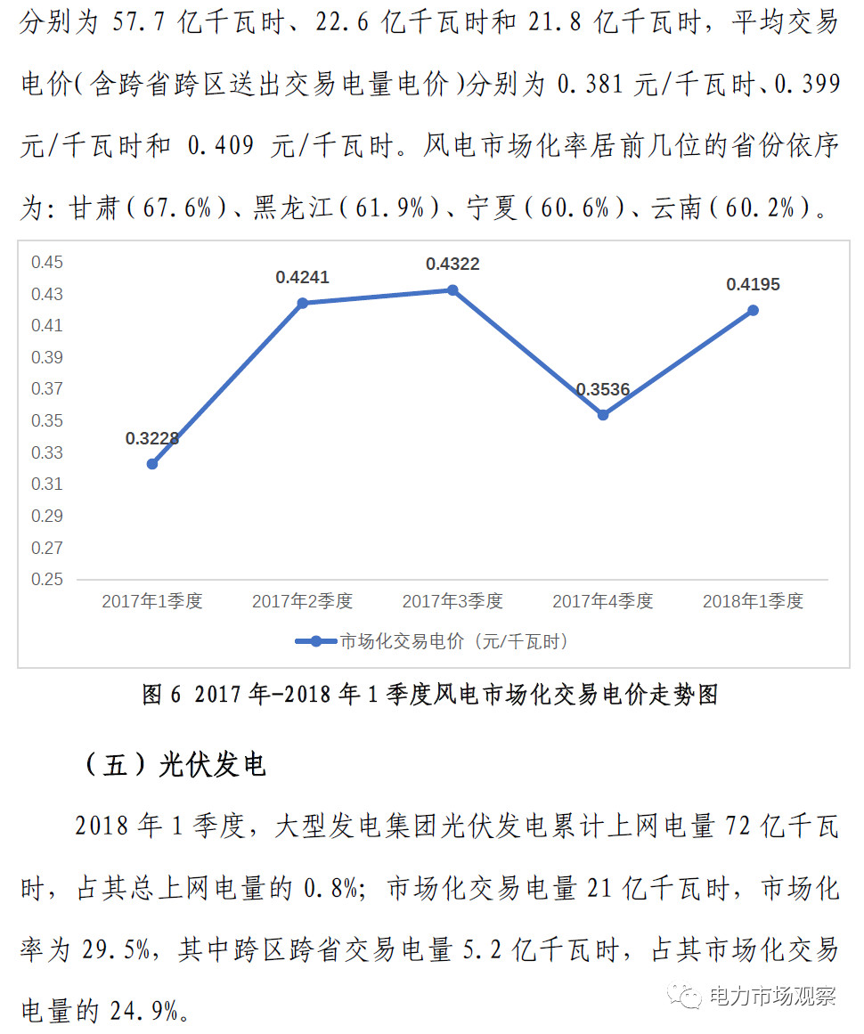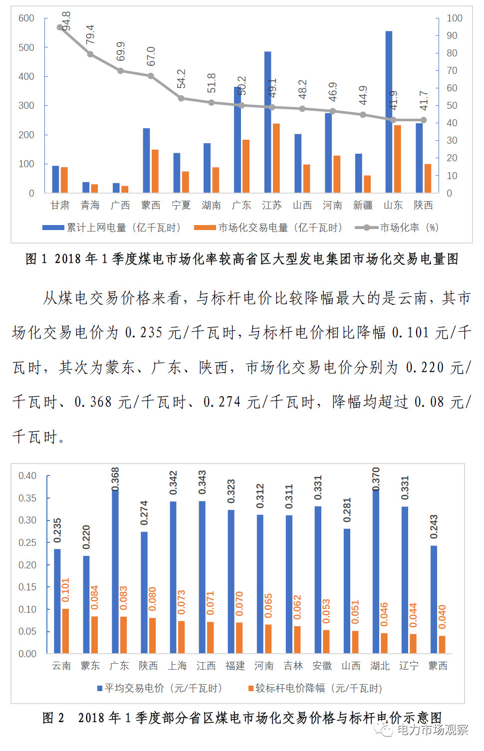 “全國電力市場交易信息分析(2018年1季度)”指出,2018年1季度:全國全社會(huì)用電量:累計(jì):15878億千瓦時(shí);同比增長9.8%。電網(wǎng)企業(yè)銷售電量:合計(jì):12901億千瓦時(shí);同比增長12.3%。全國市場化交電量(含發(fā)電權(quán)交易):市場化電量合計(jì):3322億千瓦時(shí);省內(nèi):2576億千瓦時(shí)(占比77.5%);省間(含跨區(qū)):702億千瓦時(shí)(占比21.1%);發(fā)電權(quán)交易:44億千瓦時(shí)。全國市場化電量占比:占全社會(huì)用電量20.9%;占電網(wǎng)企業(yè)銷售電量25.7%。11家大型發(fā)電集團(tuán) 市場化電量:合計(jì)2427億千瓦時(shí)(不含發(fā)電權(quán)交易);占大型發(fā)電集團(tuán)上網(wǎng)電量的29%占全國市場化交易電量的73%。