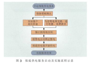 對(duì)于前兩類,主要由保底供電商(電網(wǎng)企業(yè)或配電網(wǎng)運(yùn)營(yíng)者)按政府核定價(jià)格供電。對(duì)于第3類用戶,當(dāng)售電公司無(wú)法為其提供售電服務(wù)時(shí),按照《有序放開配電網(wǎng)業(yè)務(wù)管理辦法》,要求配電網(wǎng)運(yùn)營(yíng)者直接啟動(dòng)保底供電服務(wù)。保底供電服務(wù)流程目前尚不清晰,參照國(guó)外實(shí)踐經(jīng)驗(yàn),建議保底供電服務(wù)實(shí)施流程如下:保底供電商啟動(dòng)保底供電服務(wù),告知用戶相關(guān)信息,與原售電公司進(jìn)行交接,進(jìn)行電量、電費(fèi)清分;征得用戶同意后簽訂供用電合同,原售電公司與用戶簽訂合同隨之中止;保底供電商按政府核定價(jià)格進(jìn)行保底供電。當(dāng)用戶選擇其他售電公司,辦理完相關(guān)更換程序后,保底供電服務(wù)終比。具體流程如圖3所示。