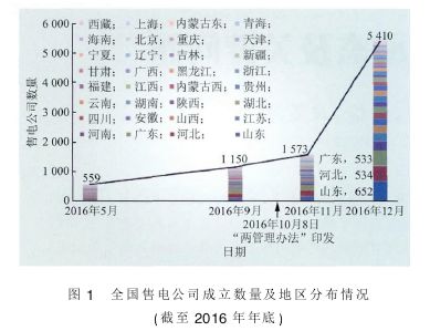 隨著電力體制改革的推進(jìn),各方參與售電市場(chǎng)積極性較高,各地陸續(xù)成立售電公司。根據(jù)“全國(guó)工商局企業(yè)信用信息公示系統(tǒng)”逐省統(tǒng)計(jì),截至2016年底,全國(guó)已有5 410家從事售電的公司。全國(guó)售電公司成立數(shù)量及地區(qū)分布情況見圖1。