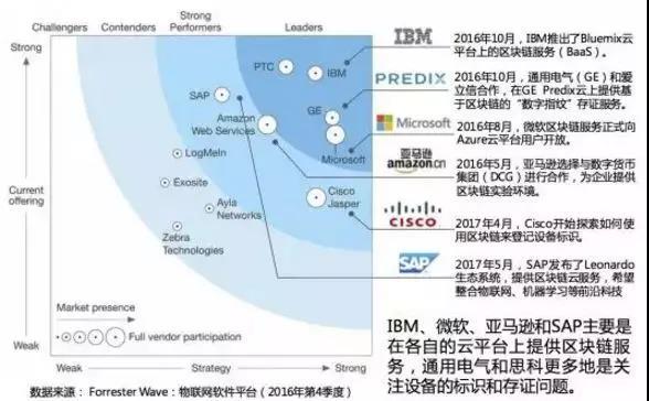 物聯(lián)網(wǎng)龍頭紛紛開(kāi)始布局區(qū)塊鏈,根據(jù)Forrester Wave:物聯(lián)網(wǎng)軟件平臺(tái)(2016年第4季度)的報(bào)告顯示,IBM、PTC、GE和微軟已成為占據(jù)物聯(lián)網(wǎng)平臺(tái)市場(chǎng)的主導(dǎo)企業(yè)。SAP、AWS、Cisco、LogMeln、Exosite、Ayla Networks和Zebra Technologies名列前11名。