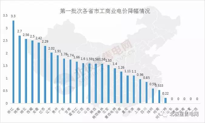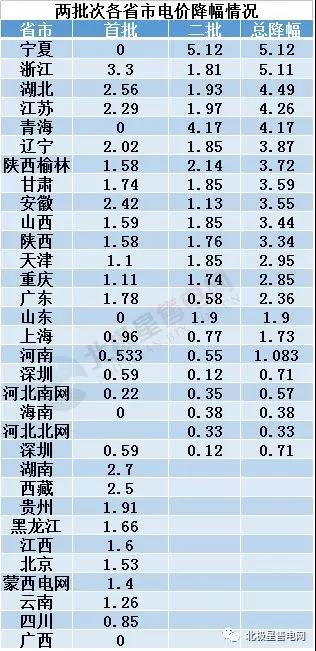 從兩批次降電價(jià)總體情況來(lái)看,寧夏以5.12分的最大降幅位列全國(guó)首位,其次為浙江,在首批降電價(jià)方案中,浙江宣布降低省一般工商業(yè)及其他用電目錄電價(jià)和輸配電價(jià)每千瓦時(shí)3.3分(含稅),而在第二批降電價(jià)方案里,浙江再次將一般工商業(yè)及其他用電目錄電價(jià)和輸配電價(jià)降1.81分/千瓦時(shí),兩批次降幅合計(jì)在5.11分,位列降幅榜第二位,也成為目前降幅在5分以上的兩省份之一。排在第三位的湖北省在第一批降電價(jià)方案里,湖北省一般工商業(yè)及其他用電目錄電價(jià)及輸配電價(jià)同降0.0256元/千瓦時(shí),第二批湖北降低一般工商業(yè)及其他用電目錄電價(jià)、輸配電價(jià)0.0193元/千瓦時(shí),兩批次降幅達(dá)到4.49分。