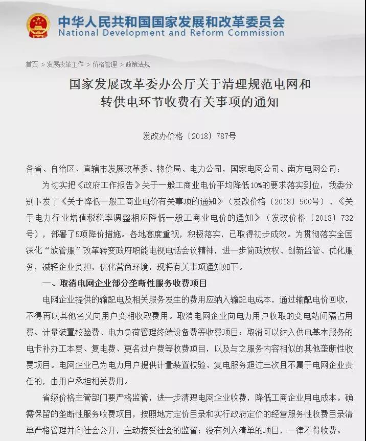 近日,國家發(fā)改委在《關于清理規(guī)范電網(wǎng)和轉供電環(huán)節(jié)收費有關事項的通知》(發(fā)改辦價格〔2018〕787號)提出,取消電網(wǎng)企業(yè)部分壟斷性服務收費項目、全面清理規(guī)范轉供電環(huán)節(jié)不合理加價行為。