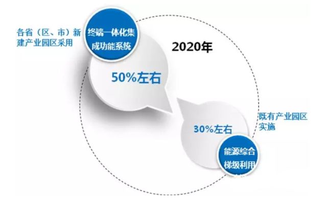 到2020年,各省(區(qū)、市)新建產(chǎn)業(yè)園區(qū)采用終端一體化集成供能系統(tǒng)的比例達(dá)到50%左右,既有產(chǎn)業(yè)園區(qū)實(shí)施能源綜合梯級(jí)利用改造的比例達(dá)到30%左右,具體見(jiàn)圖3。由于既有園區(qū)改造成本高,供水、供熱等行業(yè)存在壟斷難以介入,且改造比例相對(duì)較小,因此以新建產(chǎn)業(yè)園區(qū)作為重點(diǎn)布局。