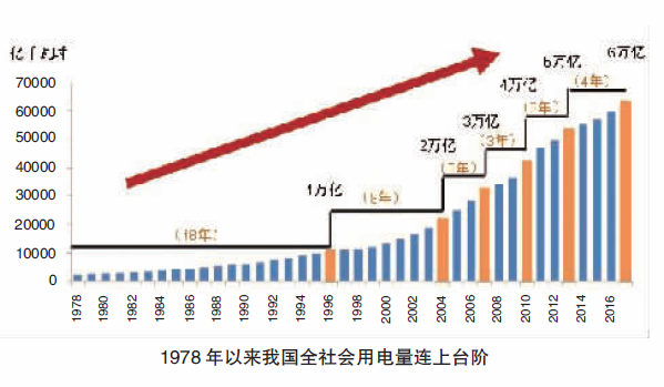 電力消費(fèi)規(guī)模走過(guò)了由小變大、屢上臺(tái)階的輝煌歷程。1978年,全國(guó)電網(wǎng)覆蓋率不到一半,全社會(huì)用電量?jī)H為2498億千瓦時(shí)。隨著經(jīng)濟(jì)的快速發(fā)展和人民生活水平的明顯提升,我國(guó)電力消費(fèi)規(guī)模不斷創(chuàng)出新高。在經(jīng)歷了漫長(zhǎng)的18年后,我國(guó)全社會(huì)用電量終于在1996年突破1萬(wàn)億千瓦時(shí),隨后電力消費(fèi)進(jìn)入了快速增長(zhǎng)期,全社會(huì)用電量由1萬(wàn)億千瓦時(shí)上升至2萬(wàn)億千瓦時(shí)用了8年(1997~2004年);隨后的9年中,每3年上一個(gè)臺(tái)階,分別在2007年、2010年和2013年實(shí)現(xiàn)了3萬(wàn)億、4萬(wàn)億、5萬(wàn)億千瓦時(shí)的突破。2011年,我國(guó)全社會(huì)用電量位居世界第一位。隨著經(jīng)濟(jì)“新常態(tài)”階段的到來(lái),我國(guó)用電量增長(zhǎng)的步伐略有放緩,但也僅用4年的時(shí)間,就突破了6萬(wàn)億千瓦時(shí),于2017年達(dá)到6.4萬(wàn)億千瓦時(shí),比改革初期增長(zhǎng)了24倍多,比整個(gè)美洲或歐洲的用電量還多。