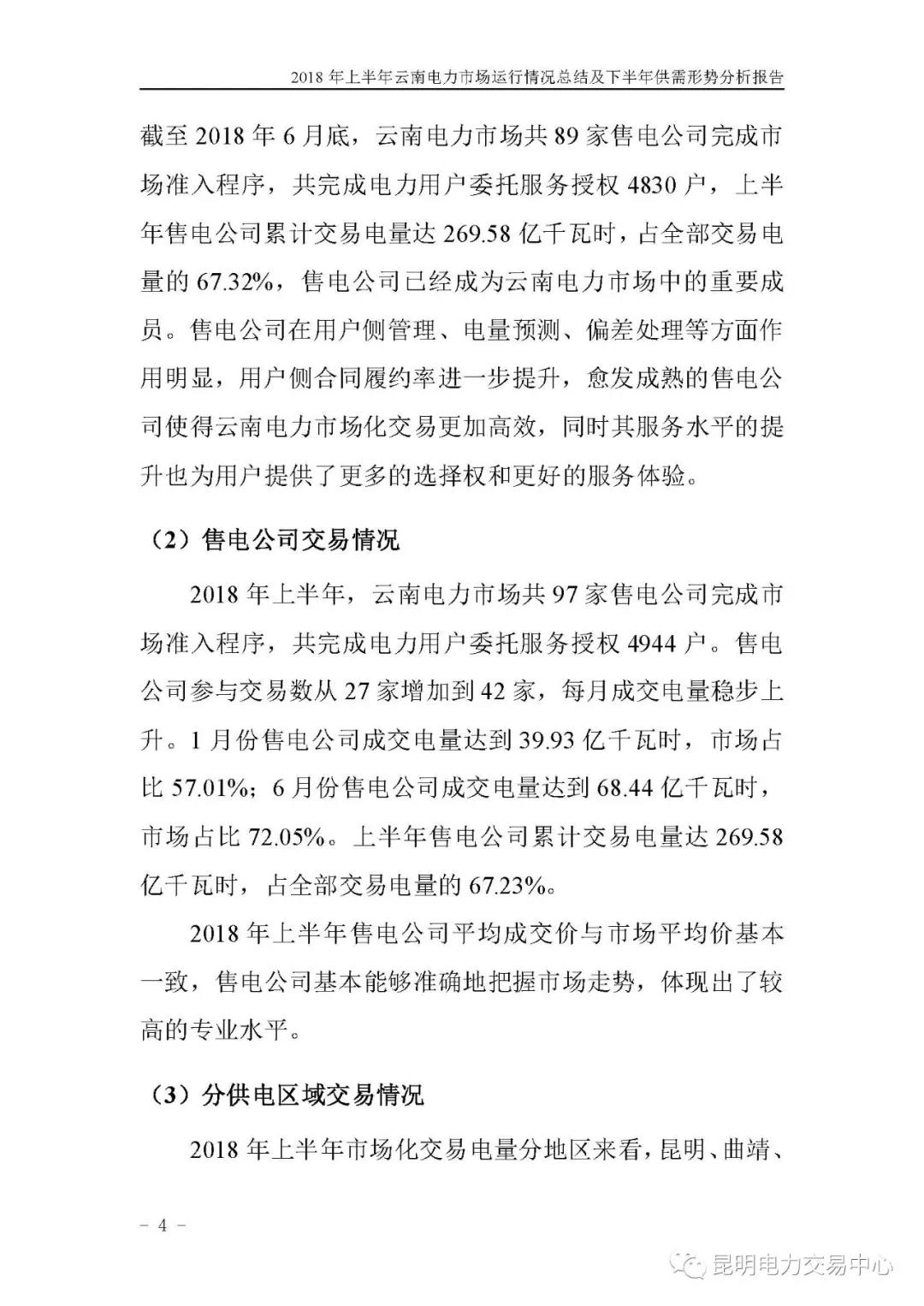 售電公司培育成效顯著:售電公司業(yè)務(wù)發(fā)展明顯,截至2018年6月底,云南電力市場共89家售電公司完成市場準(zhǔn)入程序,共完成電力用戶委托服務(wù)授權(quán)4830戶,上半年售電公司累計(jì)交易電量達(dá)26958億千瓦時(shí),占全部交易電量的67.32%,售電公司己經(jīng)成為云南電力市場中的重要成員。