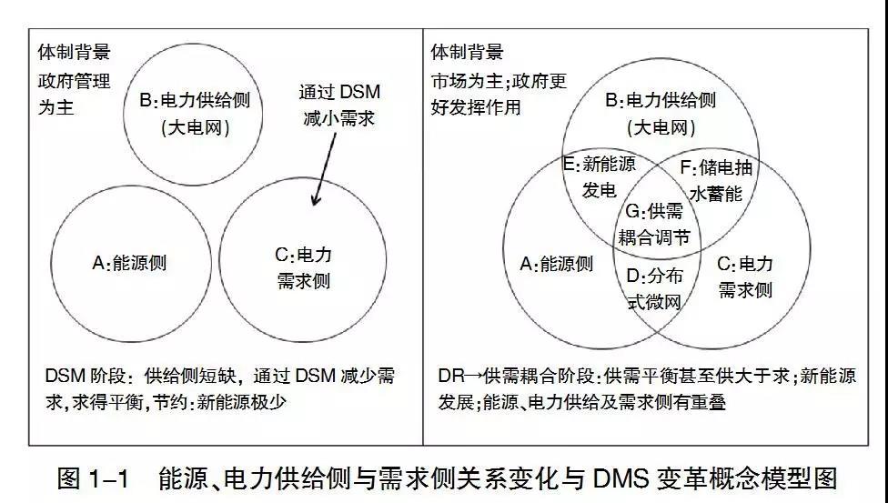 圖1-1是說明能源側(cè)、電力供給側(cè)、電力需求側(cè)的關(guān)系變化與DMS變革的概念模型圖。圖中“A:能源側(cè)”“B:電力供給側(cè)”“C:電力需求側(cè)”等3個(gè)圓形圖案。雖然電力的供與需在物理上共同組成一個(gè)系統(tǒng),且電能的發(fā)、輸、配、供、用在電網(wǎng)內(nèi)是瞬間平衡的,但各環(huán)節(jié)的概念是清晰的。圓圈圖之外可以看成是體制機(jī)制部分,圖的左側(cè)示意DSM階段主要是發(fā)揮政府行政管理的作用,而圖的右側(cè)示意DSM向DR及供需耦合階段的變革主要是發(fā)揮市場機(jī)制的作用,但政府也應(yīng)更好發(fā)揮作用。在圖的左側(cè)部分可以看出,DSM第一階段是在供給短缺、政府管理背景下,A、B、C三個(gè)不相交的圓(或者相交極少)所代表的方面,各方按上下游關(guān)系和各自規(guī)律運(yùn)轉(zhuǎn)。在這一階段,DSM主要通過減少電力需求側(cè)的需求(節(jié)約),解決供給側(cè)的缺口或者滿足調(diào)峰需求,達(dá)到電網(wǎng)及電力系統(tǒng)安全前提下,技術(shù)層面上的供需平衡。顯然,此階段的DSM顯然不是為了解決能源電力低碳轉(zhuǎn)型問題。在圖的右半部分可以看出,在供需平衡或富余、市場手段為主政府發(fā)揮更好作用背景下, A、B、C三個(gè)圓相交了,相交后形成了4個(gè)新區(qū),即D:分布式微網(wǎng)區(qū);E:新能源發(fā)電區(qū);F:儲(chǔ)電包括抽水蓄能區(qū);G:供需耦合區(qū)。當(dāng)然,A、B、C三個(gè)圓并不是同時(shí)相交的,相交的面積重合度也不同。三圓相交時(shí)間和重合度大小,決定了SM向DR方向變革的快慢和程度,這也是各國的DR并不是同一個(gè)模式的原因。在圖上雖然沒有顯示出來,但A、C兩個(gè)大圓所包括的所有內(nèi)容都是智能電網(wǎng)覆蓋區(qū),圓與圓相重合的部分是智能電網(wǎng)能夠發(fā)揮最大作用的部分;G部分是電力供需耦合發(fā)揮作用的部分。而A、B、C三個(gè)大圓則是能源互聯(lián)網(wǎng)覆蓋區(qū),也說明了,能源互聯(lián)網(wǎng)的基礎(chǔ)和核心是智能電網(wǎng)。我們由前述的未來發(fā)展的趨勢(shì)可知,3大圓相交的部分會(huì)越來越大,所以DR發(fā)揮作用的范圍也越來越大,當(dāng)3圓相交到很大程度時(shí),電力供需耦合將發(fā)揮主導(dǎo)作用。