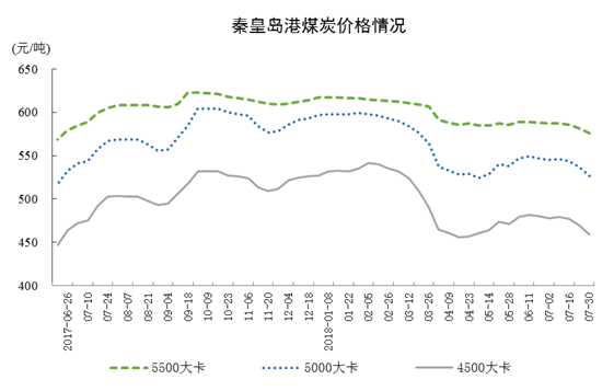 2)煤炭方面:7月份原煤生產(chǎn)有所回落,同比下降2.0%,煤炭進口大幅增加,價格平穩(wěn)回落。截至7月30日,秦皇島綜合煤炭價格較6月份每噸下降12-21元不等。