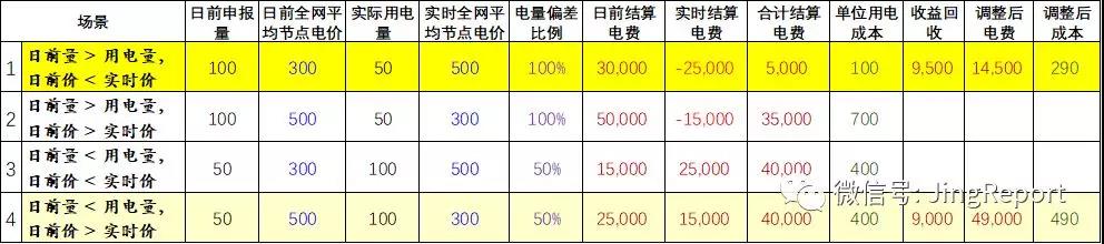 首先假設最大申報偏差率()為5%,根據(jù)日前申報電量、實際用電量和日前電價、實時電價的大小不同,排列組合下列四種場景進行對比: