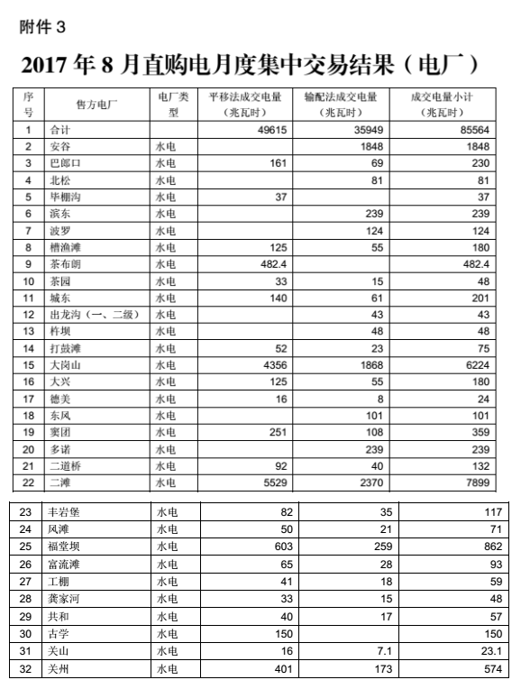 從四川電力交易中心獲悉,2017年7月24日和25日,四川電力交易中心分別組織開展了8月份月度直購電和富余電量交易。共有91家用電企業(yè)和150家發(fā)電企業(yè)成交,成交電量85564兆瓦時(shí)。具體公告如下: