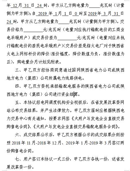 為便于交易組織和電網(wǎng)公司結(jié)算,請參與用戶在提交意向協(xié)議時(shí),按照實(shí)際用電能力,將總電量按照2018年11月1日-2018年12月31日、2019年1月1日-2019年3月31日兩個(gè)時(shí)間段進(jìn)行分配并在意向協(xié)議中加以注明(其中,陜西省地方電力(集團(tuán))有限公司榆林區(qū)域內(nèi)用戶只能自主參與2019年時(shí)間段內(nèi)電量交易,故提交協(xié)議時(shí)只需填報(bào)2019年時(shí)間段電量即可),待成交結(jié)果公示后,用戶按照兩個(gè)時(shí)間段簽訂兩份購售電合同。
