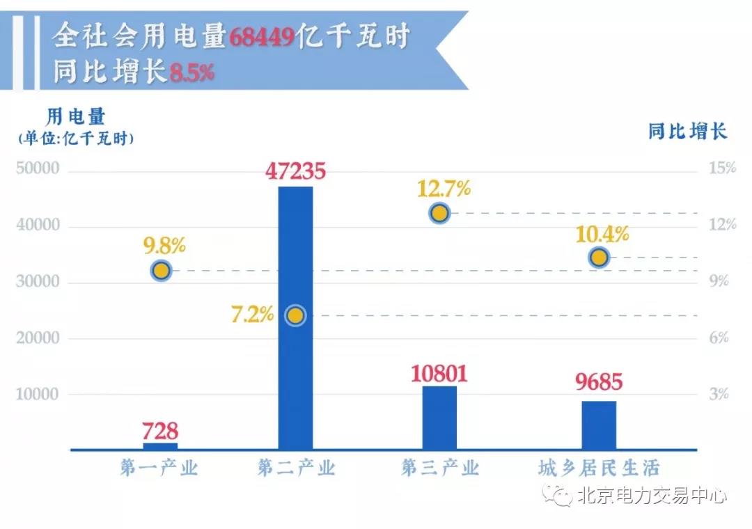 2018年,全社會用電量68449億千瓦時,同比增長8.5%。