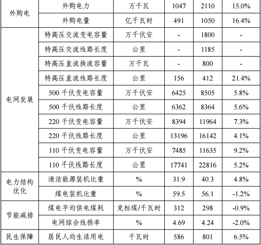 ——電力保障跨上新臺階。全省電力需求保持穩(wěn)步增長,到2020年,最高負荷、用電量分別達到8030萬千瓦、4220億千瓦時,年均增長5%、3.5%。電力保障能力顯著增強,境內(nèi)電力裝機容量達到9400萬千瓦左右,區(qū)外來電2240萬千瓦左右。全省220千伏及以上變電容量(換流容量)達到33640萬千伏安左右,線路長度34410公里左右。