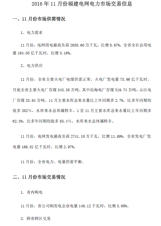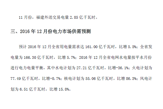 2016年11月份福建電網(wǎng)電力市場交易信息及12月份預(yù)測